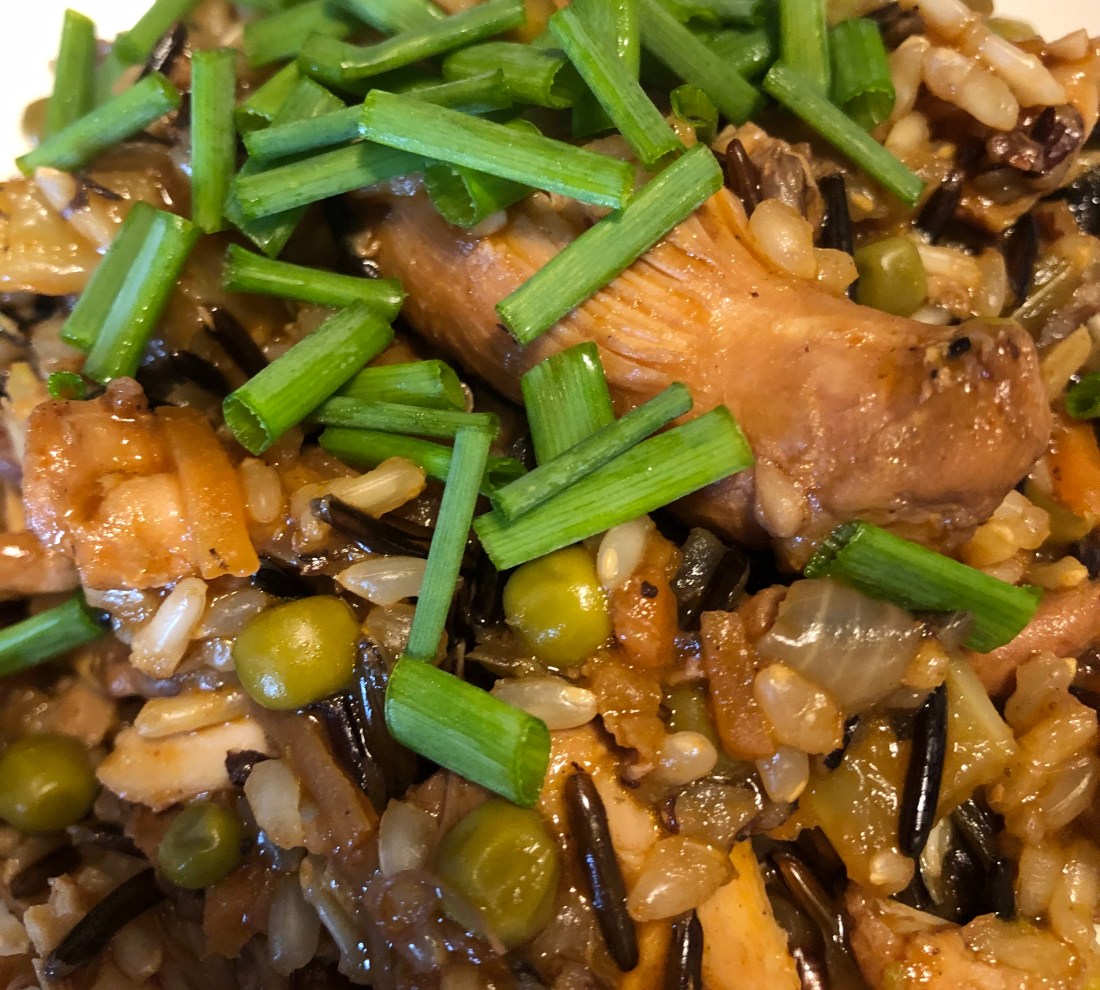 Simmer covered until rice is cooked, stirring frequently to be sure rice doesn’t stick to the bottom of the pot. This should cook out all the liquid but if not, cook uncovered until most of the liquid is gone. If the rice isn’t cooked but the liquid is all absorbed, add 1/4 cup stock and continue cooking covered until rice is done. Remove the bay leaves, taste and add additional salt if needed. Serve garnished with chives.