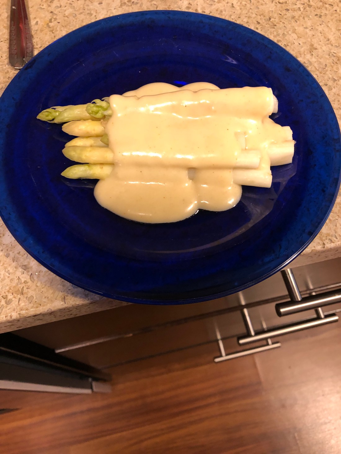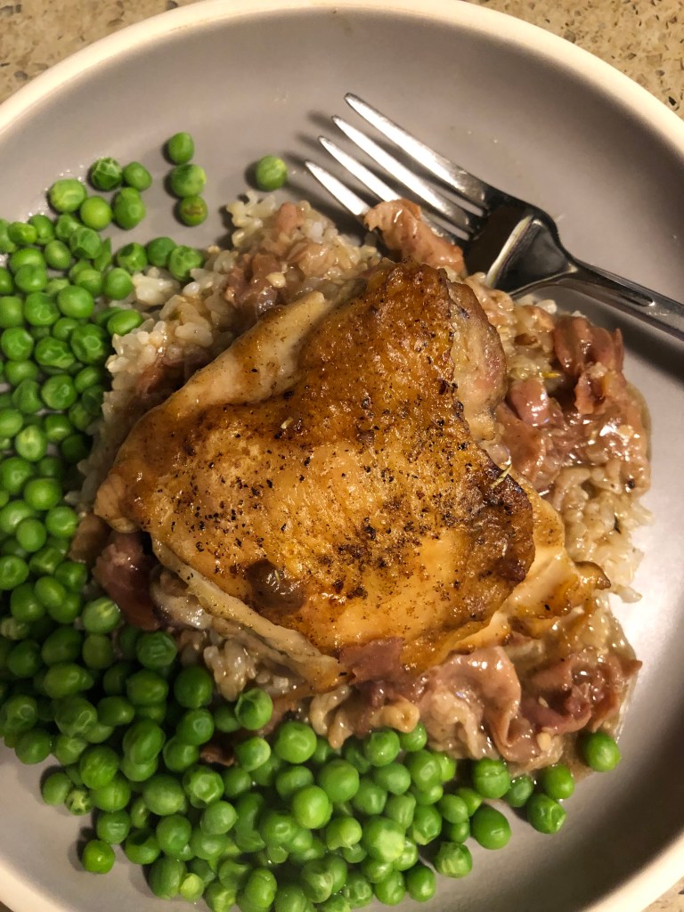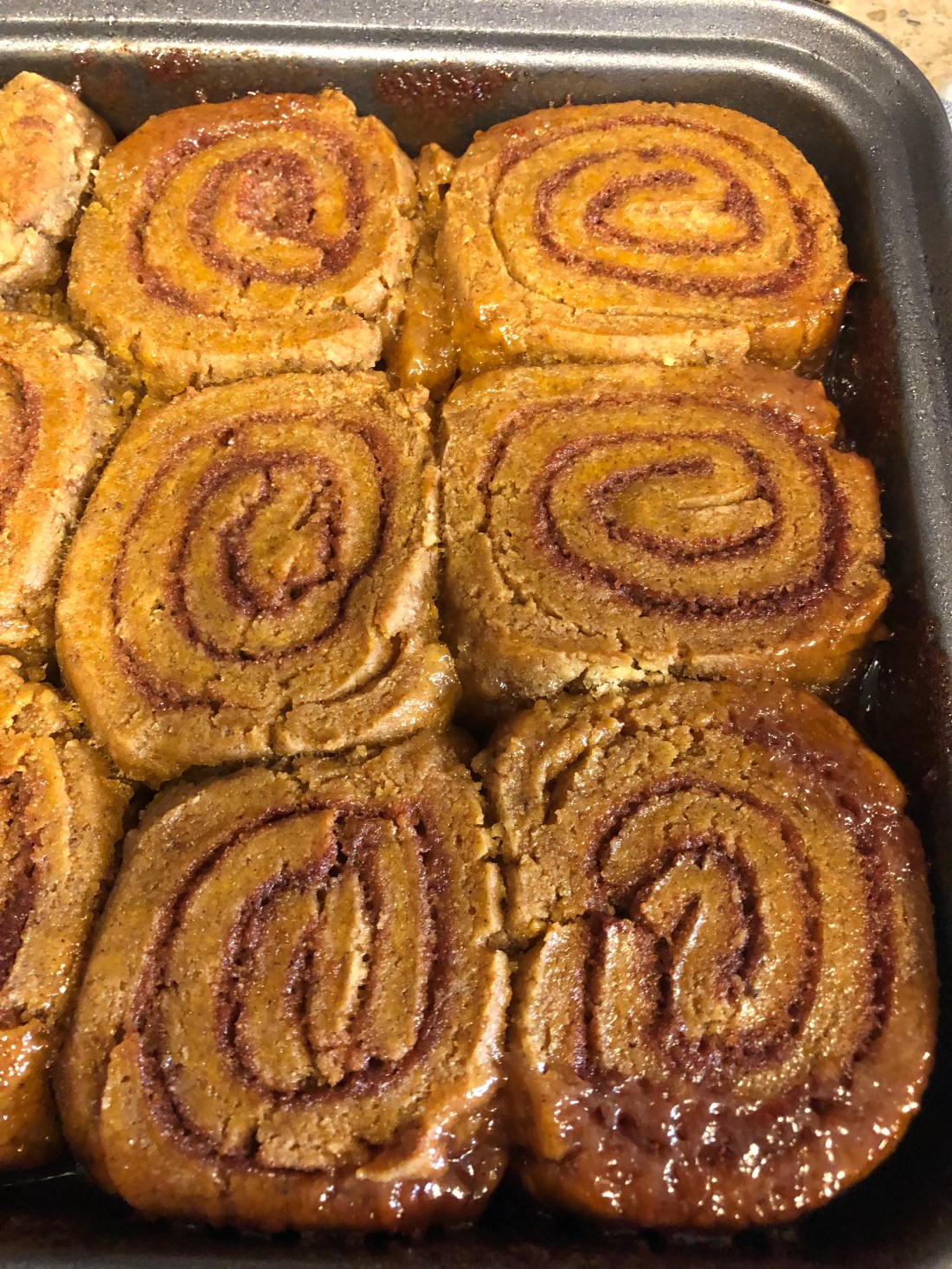 Cook just until the greens begin to wilt, add the cooked chicken along with any juice in the dish. Whisk the sauce mixture to be sure it’s still combined and pour over the chicken in the skillet. Stir continuously until the sauce thickens about 30 seconds and the chicken is reheated. Remove the noodle cake from the oven and cut into wedges. Serves 2.