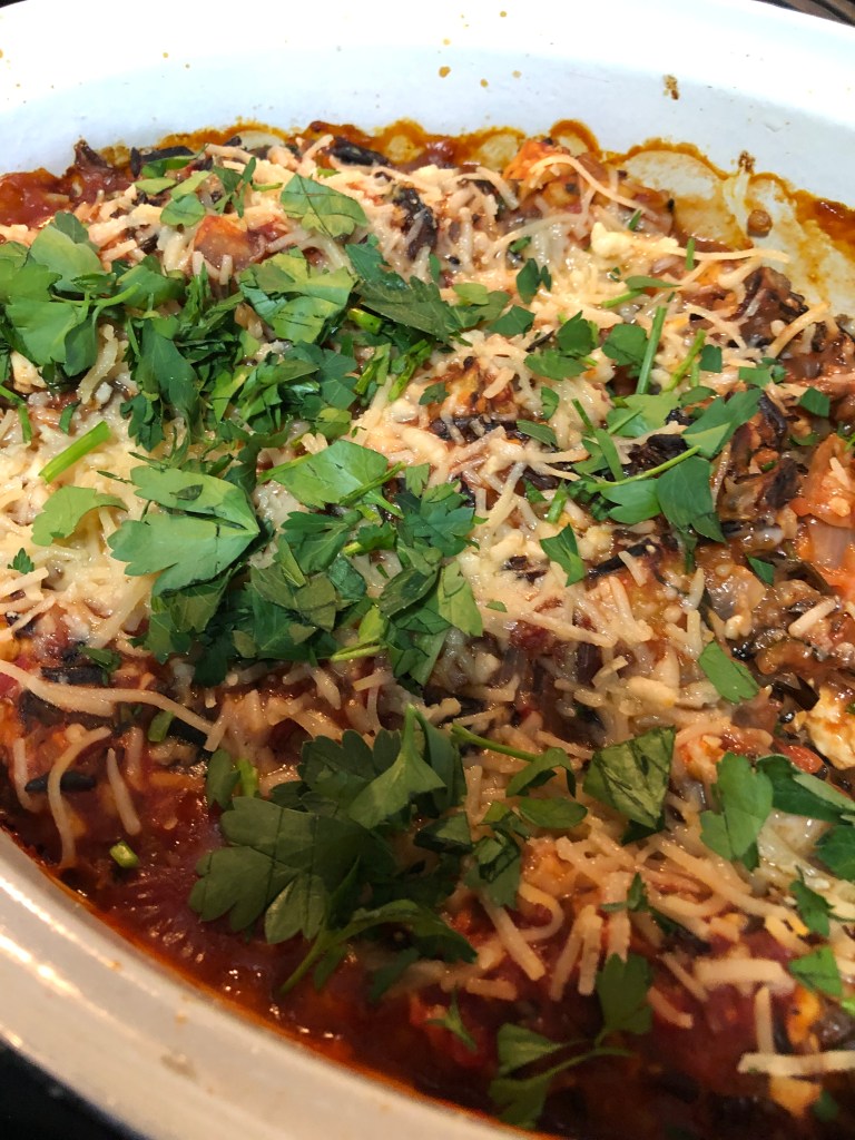 Bake until mixture is bubbling and the cheese is starting to brown, about 20-25 minutes. Sprinkle with another tablespoon or two of parsley before serving. Serves 6.