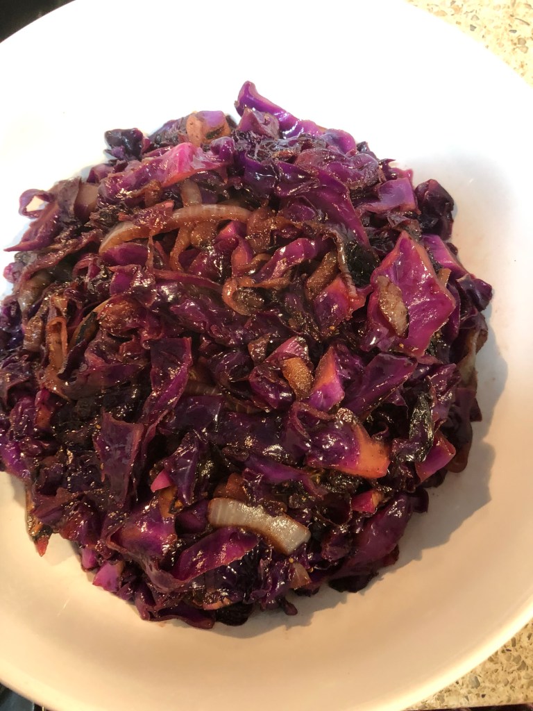 Whisk to combine and set aside. When cabbage is ready, pour the vinegar mixture into the skillet, stir to combine and let heat for about 30 seconds. Serve. Makes 2-4 servings.