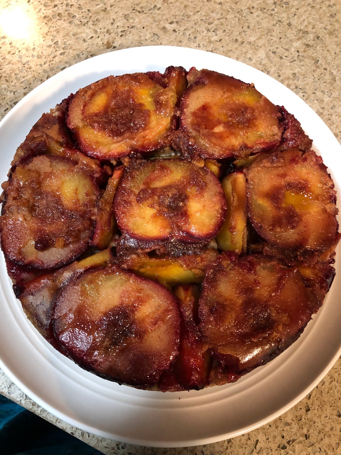 Line the pan with fruit slices. I used plums cut in half and then eighths to fit between the halves but all slices works just as well. Cut and place cut side down: