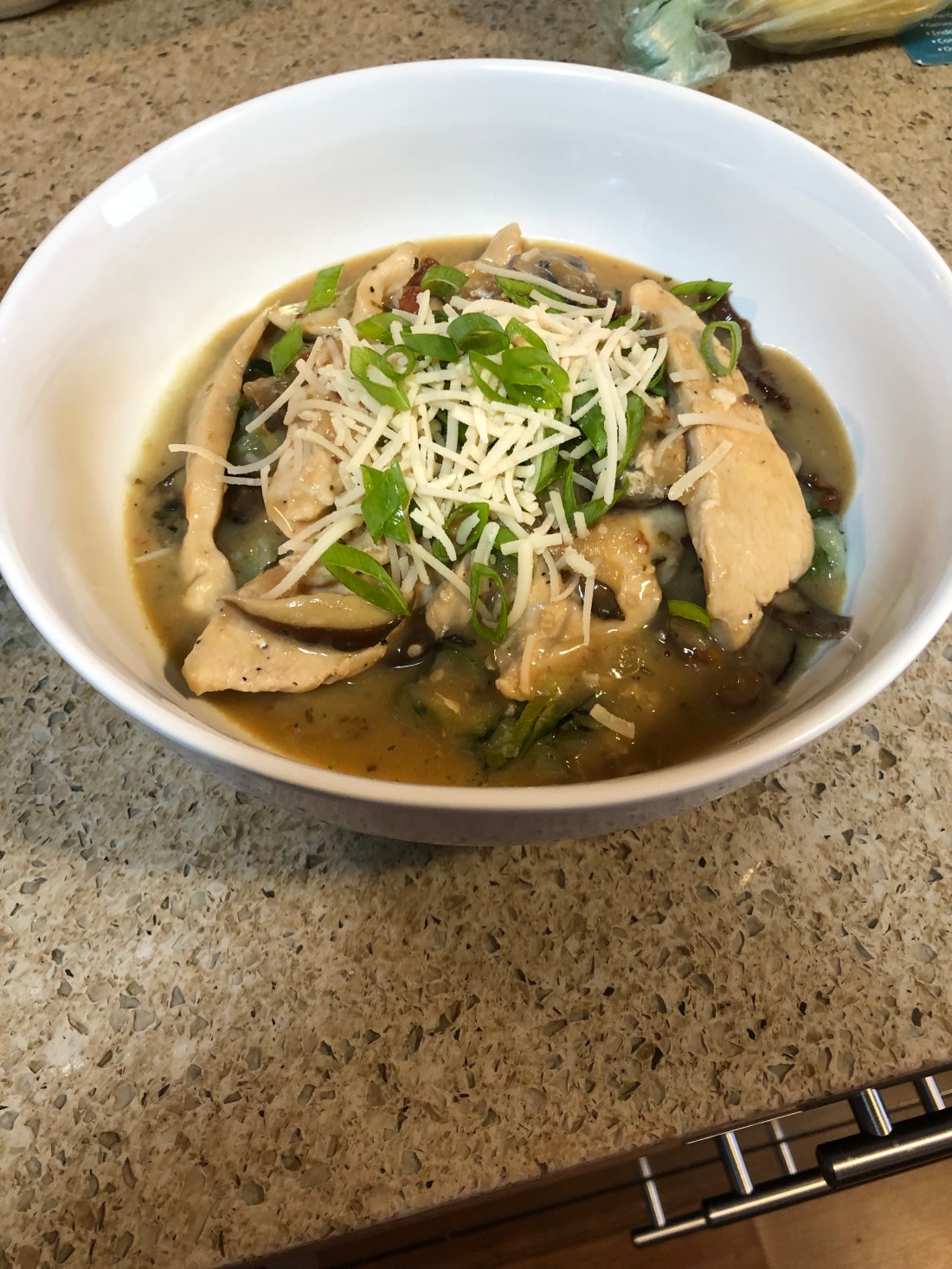 Cook the mixture for about 5 minutes to warm the chicken and melt the cheese. Serve over pasta or rice. I can testify that it’s delicious over zucchini noodles! Top with chopped parsley or scallion greens and additional cheese.