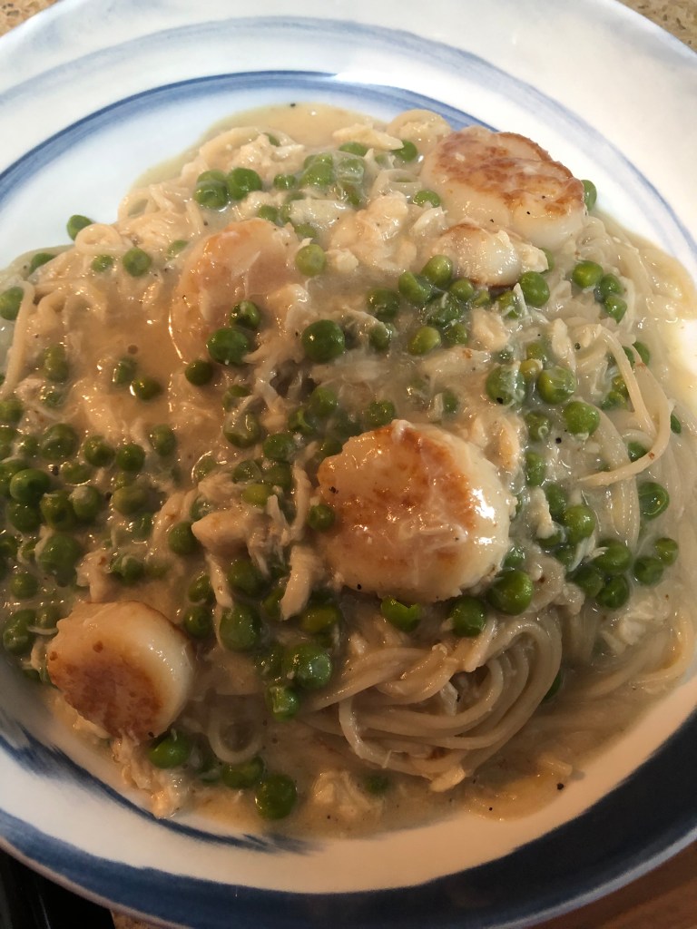Bought some beautiful scallops the other day and wondered what I could do with them. I also had a jar of crabmeat in the refrigerator and since I’ve been carving some seafood pasta, I decided to try something a little different. Generally, one can’t mix lemon juice with dairy since it curdles the milk. However, we don’t use dairy milk but plant-based milks so that doesn’t apply here. Basically, I made a white sauce with oat milk, grated in the rind of one lemon and stirred in the lemon juice, added the seafood and voila! Feel free to use whatever pasta and seafood your family enjoys.
