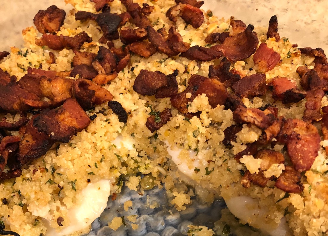 Spread the bread crumb mixture evenly over the casserole and bake for 15-20 minutes. Cool slightly before serving. Serves 6-8 generously.