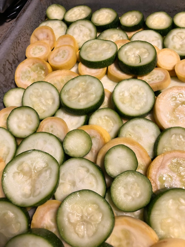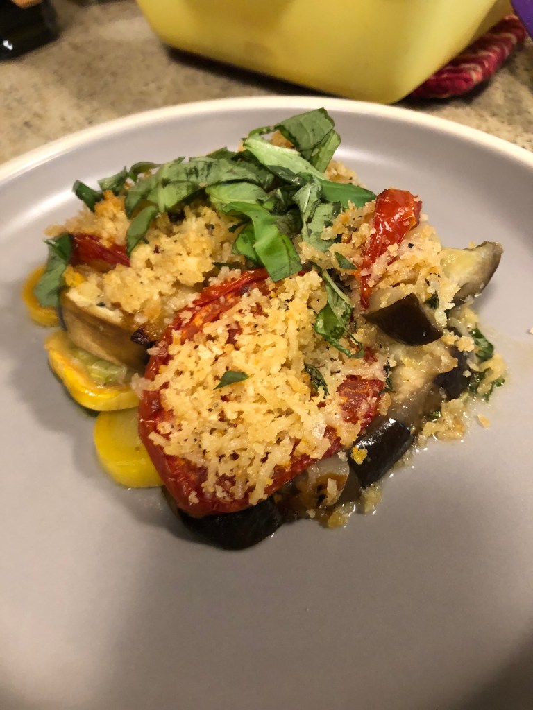 All of us love ratatouille, one of our favorite summer side dishes, especially for my grandson. So when I saw a recipe for a summer vegetable gratin it occurred to me that if I added some eggplant to it, it would be a ratatouille in a casserole with a nice crunchy top. Sounded delicious and indeed, it turned out succulent and indeed the top was very crunchy. The most important thing is to cut the vegetables all about the same so they cook at the same rate. It does take time since getting the water out of the squash and tomatoes, and the bitter out of the eggplant takes about a half hour of sitting but that time can be used to make really delicious caramelized onions. But it’s very easy to make. While I used yellow and zucchini squash, one or the other will work.