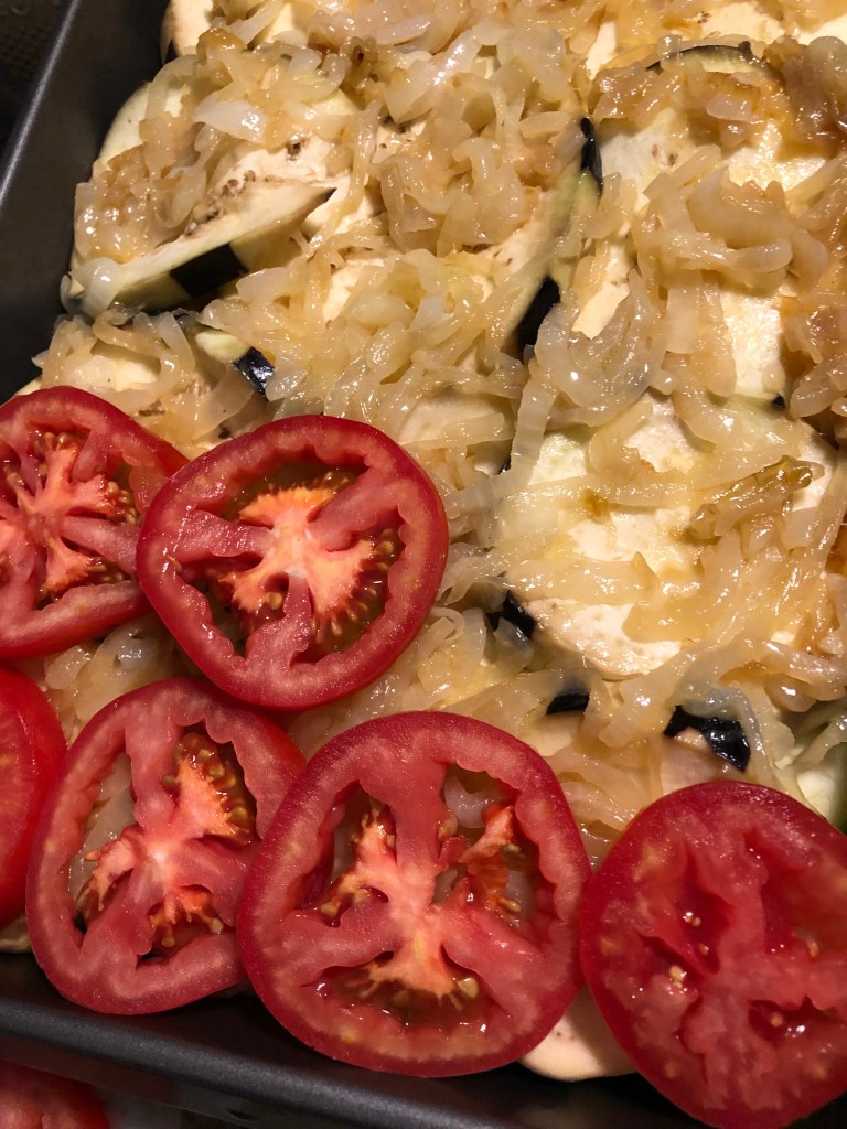 Sprinkle half the mixture over the eggplant and then turn the eggplant over so that the mixture also gets to the squash. Now layer the onions on top of the eggplant and then the tomatoes on the onions.