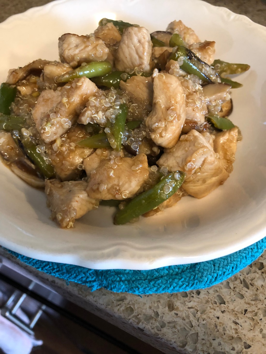 Stir constantly until mushrooms start to brown and beans are slightly crunchy. Move the beans and mushrooms to one side of the skillet and add the garlic mixture and heat until you can smell the garlic, about 30-45 seconds. Mix into the vegetables then add the turkey and any juices back into the skillet. Whisk the sauce mixture and pour it into the skillet. Stir constantly until it thickens, about 2-3 minutes. Sprinkle with more sesame seeds if desired or sliced green scallions. Make 4 servings. Serve over rice or quinoa.