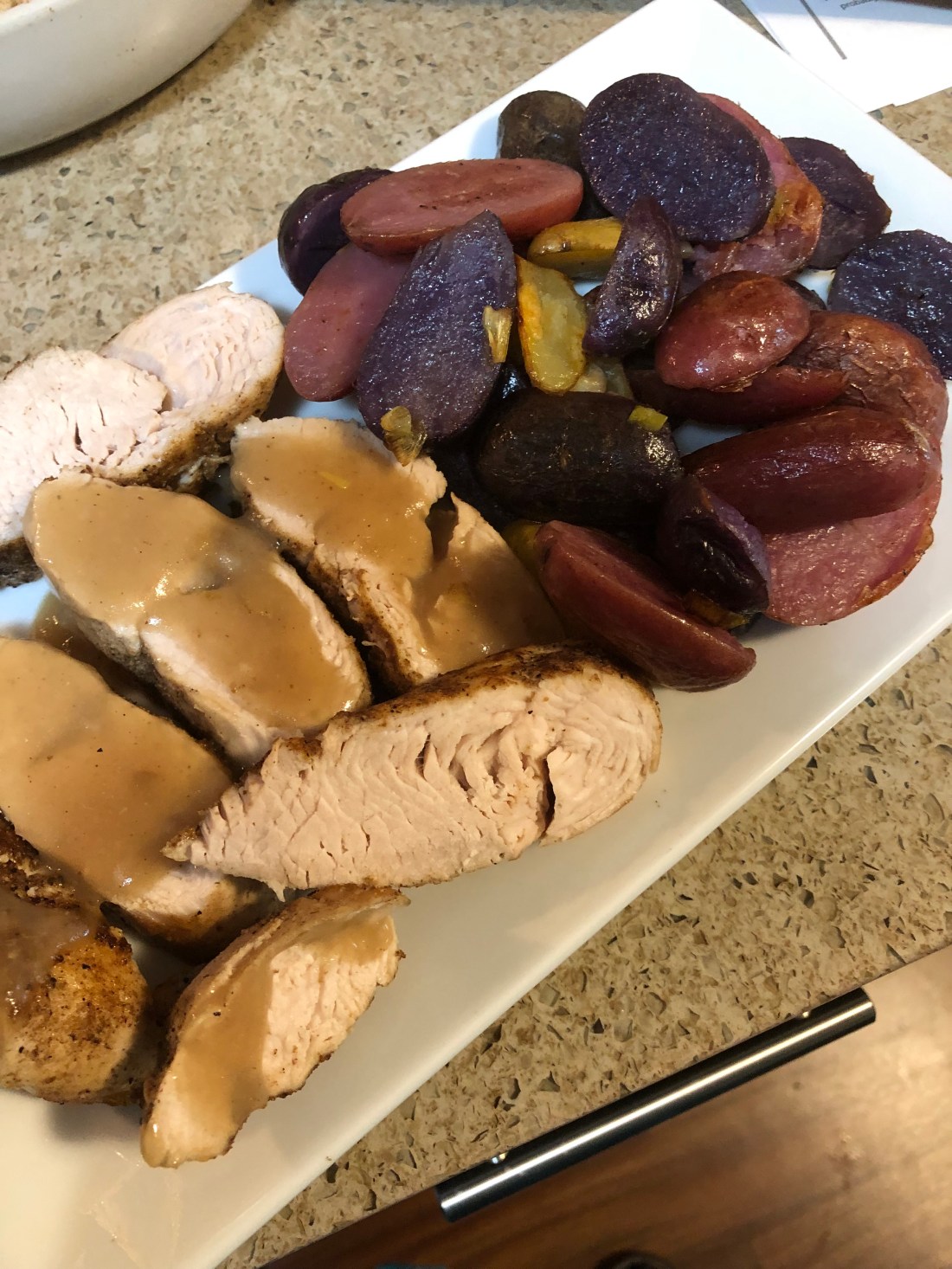 4 pounds of pork – if using a boneless roast, cut in half to make two thinner pieces and then cut each half in half; if using a bone in roast, slice into thinner pieces leaving the bone area intact