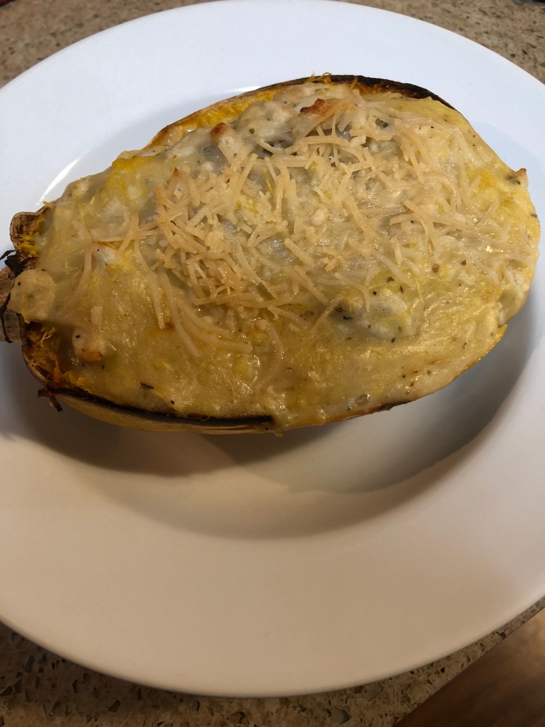 Alfredo sauce is one of the tastiest things I’ve ever eaten and it’s so easy to make. I know there are a lot of steps but it’s a very easy process, none of the steps (except maybe cutting the spaghetti squash in half! are difficult). I blogged Chicken Alfredo several years ago so just used that basic recipe for the sauce. I’ve taken out the fresh parsley because I now can’t eat it and stuffed it into a spaghetti squash which reduces the simple carbs and calories. Don’t care for spaghetti squash? No problem, just mix it up and use it as a sauce for your favorite pasta. Delicious! Enjoy.